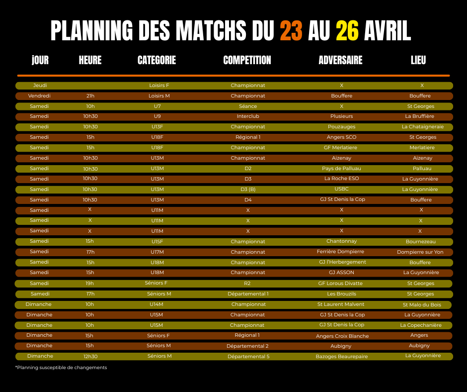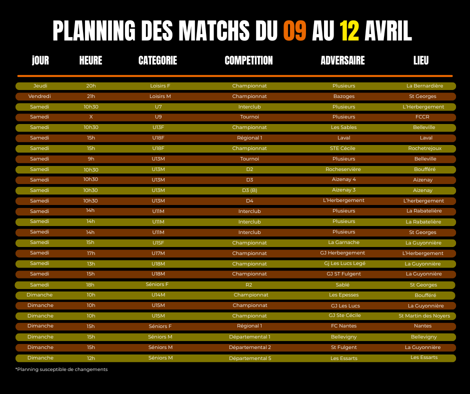 | 08 Avr | Planning Matchs du... |