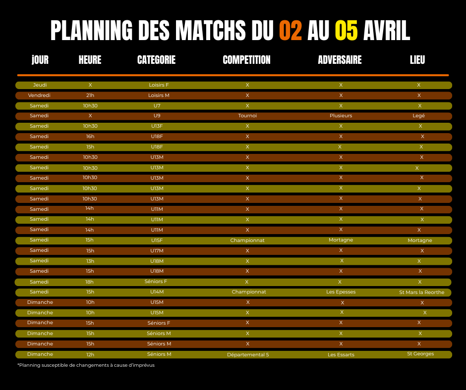 | 31 Mar | Planning Matchs du... |